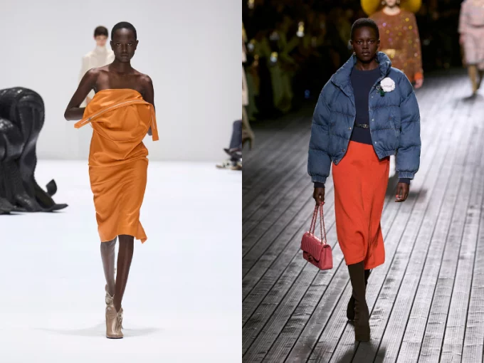 Seja em um tom vibrante ou mais clássico, o laranja é uma cor que exige cuidado para ser usada! Você pode optar por usá-lo em um look total em um vestido ou macacão, ou em apenas uma ou duas peças discretas, como nessa silhueta Chanel.